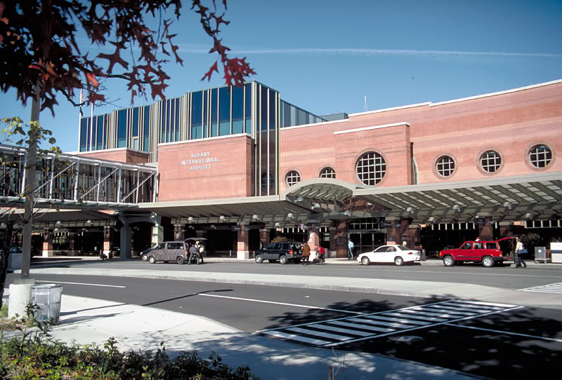 The terminal at Albany dares to be different in an industry where glass and gleaming metal are the dominant materials used in construction. The facade of Albany's terminal gives the impression of a pleasing brick edifice as seen below. It is true however, that as with many new airports, the terminal is nearly overshadowed by the huge multi-storey parking lot plunked right down in front of it.