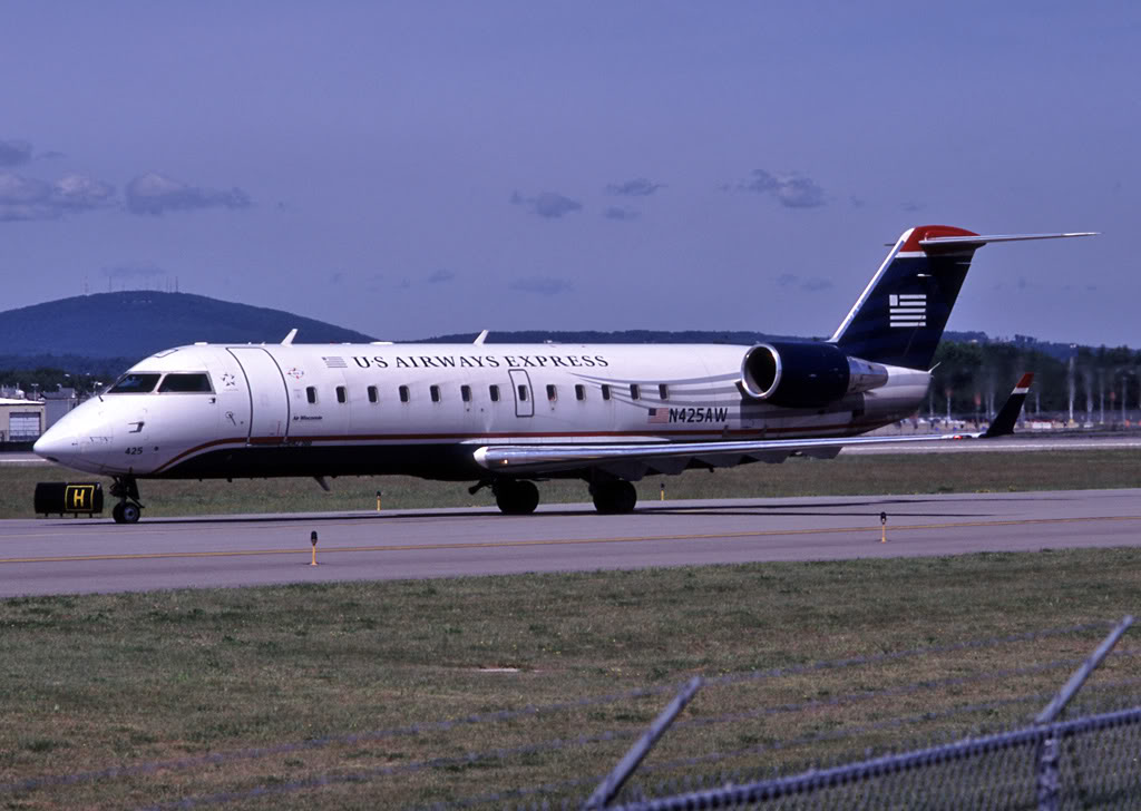 Bombardier CL600-2B19 regional jet of US Airways Express at the intersection of taxiway Hotel and Echo is about to cross runway 17-35 enroute to the gate