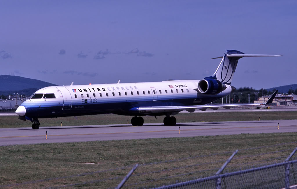 A United CL600-2C10 taxies to the gate advertising the airline’s new Explus enhanced service.