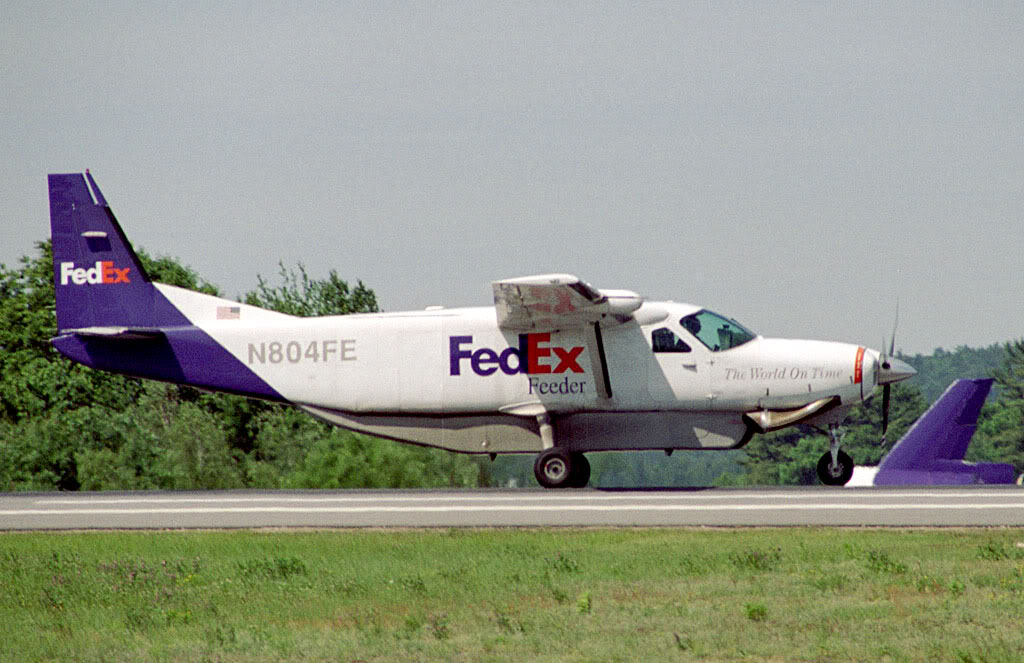 Cessna 208 Caravan in Fedex colors. In the background can be seen the tail of one of Fedex's DC-10 freighters