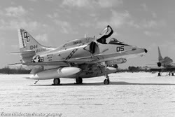 ![]() A-4E 152067 of VF-43 photographed at Westover ARB, MA., by Bob Rys on 28 April 1984. |