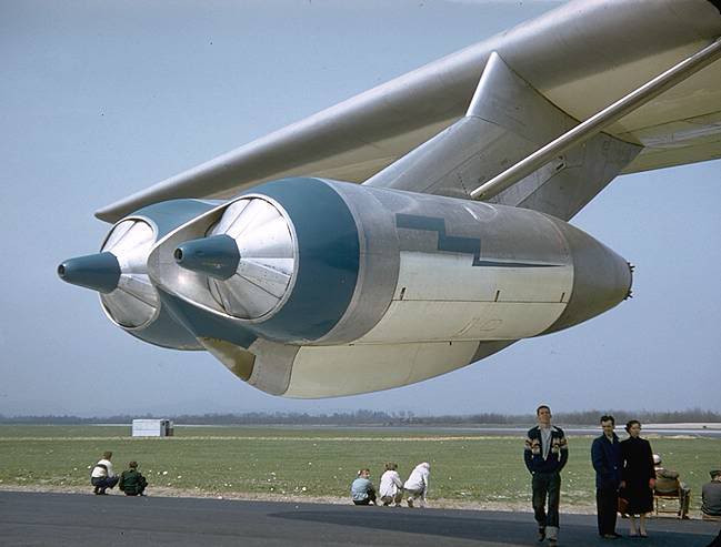 Starboard jet pod photo showing color details and closed intake doors for the two J-47 engines. Blue Jeans rolled way up were "in" |