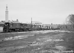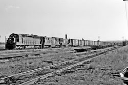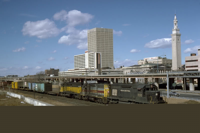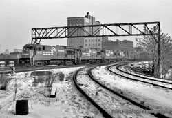 U25C 6514 has NS-1 at Columbus Ave yard Springfield, MA on 15 March 1977, about to back onto the Boston Line with the help of a puller engine.