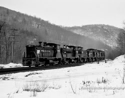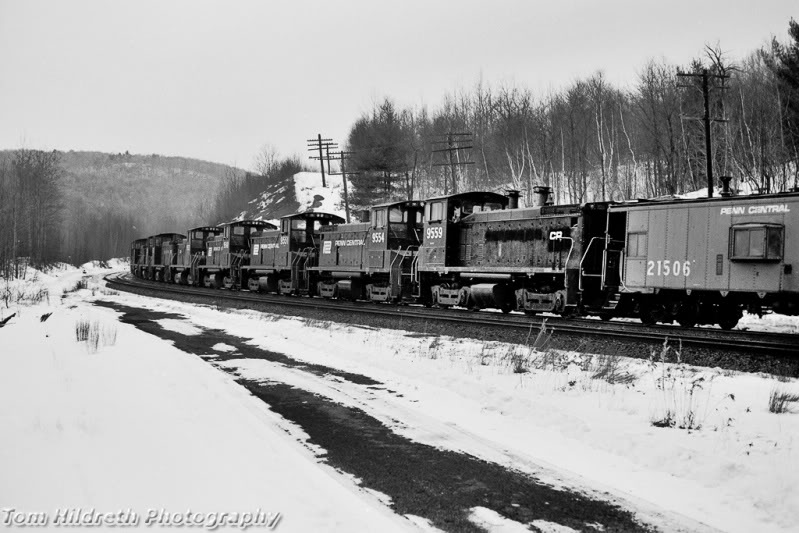 Westbound SW1500 cablight with 9531, 9521, 9520, 9528, 9527, 9532, 9551, 9554, 9559 and cab 21506 at Bancroft, MA., 19 February 1977.