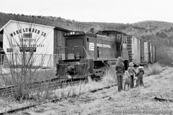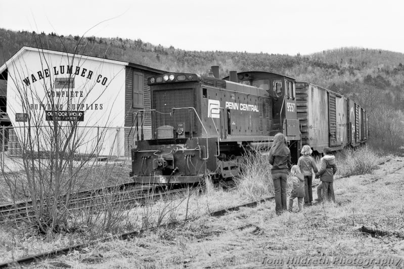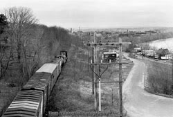 SW1500 9555 leads Conrail local NX-1 down the grade at Ingleside into Holyoke, MA., on its 21 April 1978 run over the Holyoke & Westfield branch.