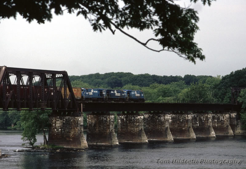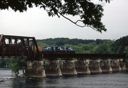 Conrail southbound heads across the Connecticut River at Windors Lock, CT., 0808 hrs. 12 July 1993..