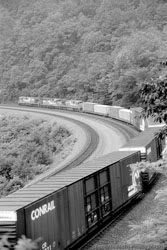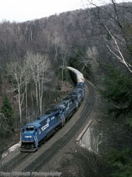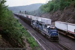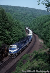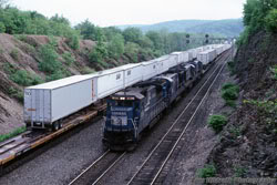 SD80MACs 4126 and 4114 lead an eastbound downhill at Middlefield, MA (MP 131) on the Boston Line on 29 May 1998.