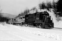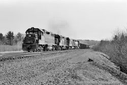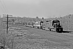 SD40 6319 and U36C 6592 are westbound with a load of empty auto racks on the Boston Line at Washington, MA, 20 April 1977.
