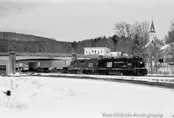 U30B 2842 and GP38-2 8013 lead eastbound TV-10S under the Rt. 112 bridge at Huntington, MA on 19 March 1977.
