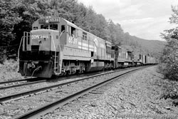U-25B 2651 leading a lashup of six units with a Conrail westbound rattles the Twin Ledges at Middlefield, MA in 1977.