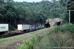 Three GE stablemates lead a westbound through the remaining bore of Stateline Tunnel, Canaan Center, NY., at 0825 hrs on 17 August 1990.
