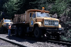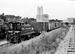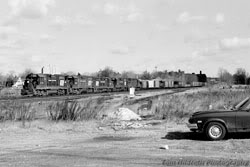 B23-7 1980 working industry off Talmage Road in Edison, NJ., 13 May 1992. Northeast corridor passenger main is on the right.