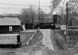 Conrail local freight clatters across the Canal Line diamond as it heads west on the Boston Line at Westfield, MA on 2 December 1976.